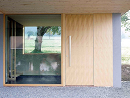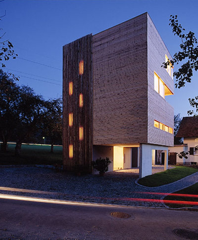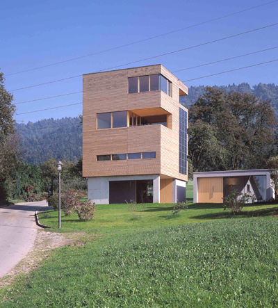 Die ausgewogene Verbindung von Massivholz, Beton und Glas entzieht sich den üblichen typologischen Mustern zwischen Ländlichkeit und High Tech-Wohntraum, und der innovative Umgang mit Material und Bauaufgabe verrät eine im Niedrigenergiehausbau geübte und sichere Handschrift. Als innovativ zu bezeichnen ist jedenfalls auch die Integration (anstelle einer nachträglichen Addition) der Photovoltaikanlage des 3-Liter-Niedrigenergiehauses ins Erscheinungsbild der Südfassade. (Text: Gabriele Kaiser, 30.05.2002)