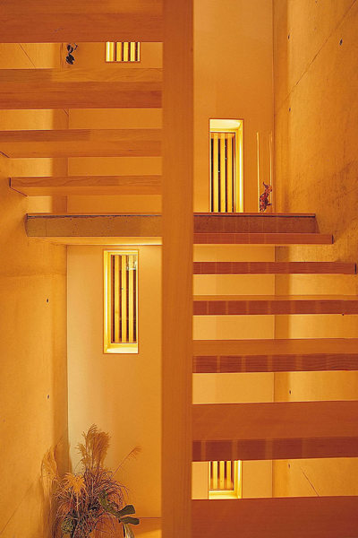 Der bauplastisch differenzierte Kubus erhebt sich wie ein eigenwilliges Möbel über die Wipfel der umgebenden Bäume. Die vertikal geschichteten Wohnebenen (Schlafen im 1. OG, Kochen und Essen im 2. OG, Wohnen im 3.OG) verfügen über je eine Loggia mit raumhoher Verglasung, die die nahe Berg- und Seenlandschaft ins Blickfeld rückt.