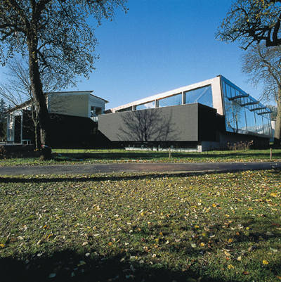 Der Innenraum hingegen sollte reich sein. Die Zufahrt über die östlich der Schule gelegene Strasse endet in einem befestigten Vorplatz. Der tunnelartige Haupteingang bildet eine ausgedehnte Schwelle, an deren Ende das Foyer liegt. Dieses Foyer stellt den Kreuzungspunkt eines Achsenkreuzes dar, welches sich in beiden Geschoßen an die Schule anbindet.