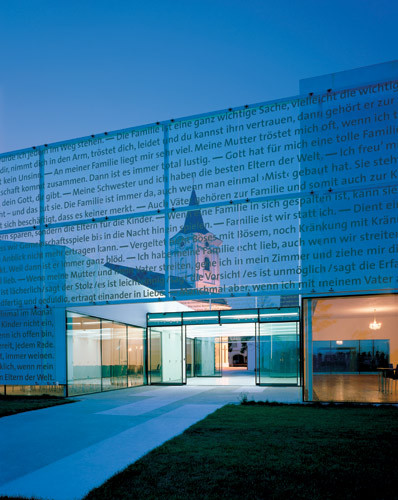 Die Fassade selbst ist schnell erklärt: Die Architekten wollten die „Kunst am Bau“ lieber gleich selbst übernehmen und haben die Podersdorfer aufgefordert, ihre Gedanken zum Thema Familie aufzuschreiben. Aus der anonymen Textsammlung wurden markante Sätze herausgezogen und in den öffentlichen Raum gestellt.