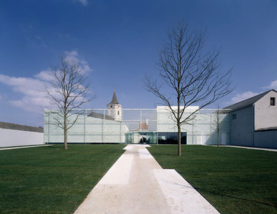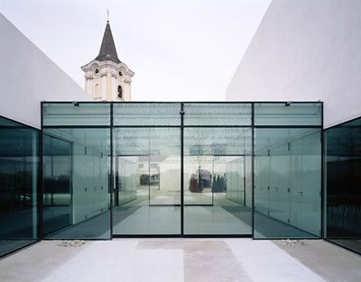 Obwohl der Bau keinen Köder auslegen musste, haben die Architekten ein offenes Haus gebaut, auch wenn die weißen Volumen hinter der beschrifteten Glaswand zunächst sehr verschlossen wirken. Im Wettbewerb ignorierten die Architekten Andreas Lichtblau und Susanna Wagner als einziges Team die Vorgabe, das schmale, aber sehr lange Grundstück hinter der alten Kirche so zu bebauen, wie es für das Ortsbild typisch gewesen wäre. Statt eines Baukörpers, der sich über die gesamte Grundstückstiefe erstreckt hätte, drehten sie das geforderte Programm um neunzig Grad, stellten also das Gebäude quer und ließen in der Mitte eine Durchfahrt frei. Fußgänger und Radfahrer, die die Abkürzung nutzen, um der verkehrsreichen Straße auszuweichen, die hinunter zum See führt, gelangen so ganz automatisch zum Kirchenraum auf der einen und oder zum Gemeindesaal auf der anderen Seite des Durchgangs.