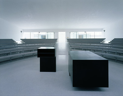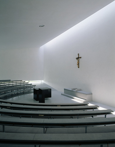 Der Versuch, Schwellen abzubauen, hat in der Architektur der letzten Jahrzehnte nicht selten dazu geführt, dass eine Kirche nur noch schwer von einer Turnhalle zu unterscheiden ist. Die Kirche in Podersdorf hingegen ist trotz ihrer minimalistischen Raumhülle das exakte Gegenteil eines Multifunktionsraums. Decke und Boden sind wie ein Trichter geformt, was zum einen akustische Vorteile bringt. Aber um nicht die kalte Geometrie zu stark werden zu lassen, wurden die Bänke in konzentrischen Kreisen wie die Ränge eines Amphitheater in den hellgrauen Terrazzoboden Boden versenkt. Um den Preis der Flexibilität zwar, aber so entsteht eine Art Gottesdienstmulde, die wohl einen innigeren Kontakt zwischen Gemeinde und Priester zu stiften vermag, als andernorts das lithurgisch motivierte Stühlerücken. Selbst wenn doch einmal nur wenige kommen sollten, wirkt der Raum nie leer.