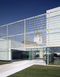 Man kann die goldene Schrift als Schmuck interpretieren, der dem Gebäude sonst fehlt, das wäre aber eine vielleicht zu architektonische Beschreibung. Treffender ist es, die Schrift als Geste zu lesen, mit der die Kirche der Umgebung ein Diskussionsangebot macht. So offen und zugänglich der Bau auch sein mag - allein weil er eine Kirche beherbergt, umgibt ihn etwas mysteriöses. Es war eine kluge Entscheidung, ihm das nicht mit einem stärker „kirchlich“ geprägten Text nehmen zu wollen, aber zu zeigen, dass es eine Schnittmenge von Themen gibt, die drinnen wie draußen die Menschen beschäftigen.