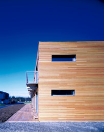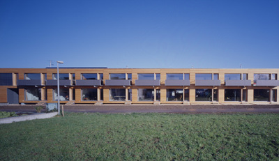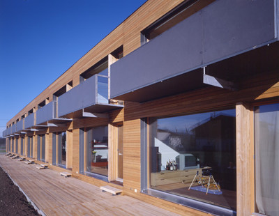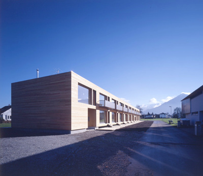 Die in Niedrigenergie-Bauweise errichtete Reihenhausanlage des „Metro“-Komplexes wurde zu 100 Prozent in Holz gefertigt - auch die Brandwände konnten (= durften) in F60-Konstruktion aus Holz errichtet werden - und bindet neun zweigeschoßige Appartments (mit je 86 m² Wohnnutzfläche) und eine Gemeinschaftseinheit zu einer schlichten orthogonalen Kette. Die Erschließungseite im Nordosten ist der neuen Bebauung zugewandt, während sich die Südwestseite des Riegels mit seinem „gläsernen Rücken“ und dem Terrassenteppich ins Freie öffnet. Die strenge Homogenität der Haus-an-Haus-Reihe leistet sich nur in der Anzahl der Treppenstufen, die auf die Terrasse führen, eine geländegefällige Abweichung und überlässt ansonsten jegliche Geste der Individualisierung den künftigen Bewohnern. Diesen steht im Erdgeschoss eine zwischenwandfreie Koch-Ess-Wohnzone zur Verfügung, eine einläufige Treppe (darunter: natürlich der Abstellraum) führt ins Zweizimmer-Obergeschoss, dessen Mittelbereich durch ein relativ geräumiges Bad aufgewertet wird. Die Logik des Grundrisses ist bezwingend, die materielle Umsetzung der „einschichtigen“ Hauskette intelligent, das Leben in seiner ganzen Komplexität willkommen geheißen. (Text: Gabriele Kaiser, 04.01.2003)