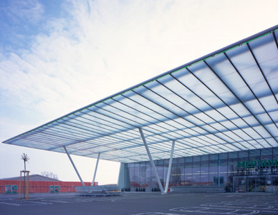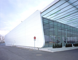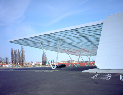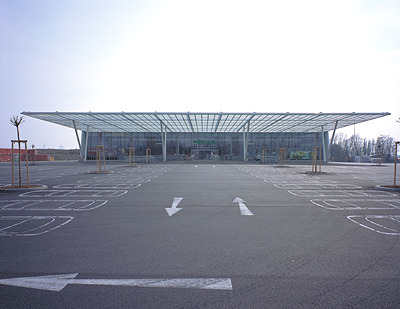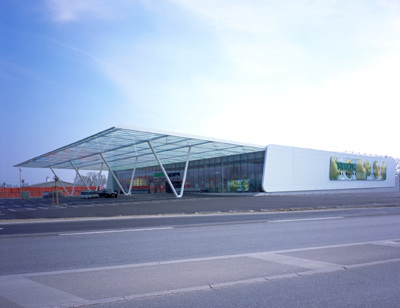 Der Markt in Leopoldsdorf reagiert auf die allerorten gestiegenen Konsum-Ansprüche vergleichsweise massvoll. Das Thema Industriebau wurde durch keine formalen Spielereien verdorben, die Abwandung der „Kiste“ verspricht und hält Qualität. Die seitlichen Betonwangen des Marktes sind an ihren Enden gerundet, die Stirnseite mit dem Eingang wurde vollflächig verglast, das Firmenlogo zum Fassadenbild stilisiert, das transluzente Vordach, das auf vier stählernen Pendelstützen ruht, greift weit in die obligate Parkfläche aus. Man bekommt, was man sieht. (Text: Gabriele Kaiser, 07.07.2002)
