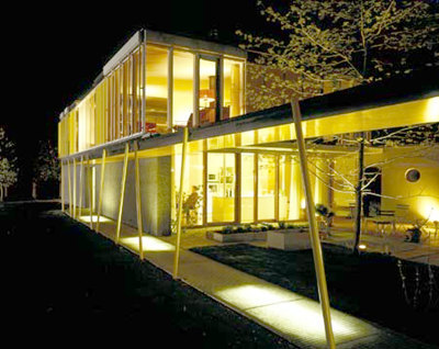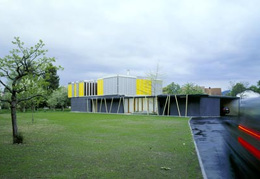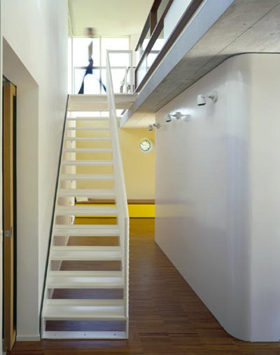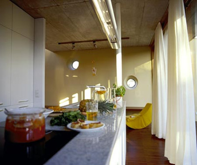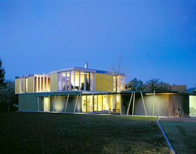 Im als Ziegelbau errichteten Erdgeschoss, in dem sich der elterliche Rückzugsbereich befindet, wird - unter Einbeziehung des üppigen Hofes - gekocht, gegessen, gewohnt, im Obergeschoss (Holzkonstruktion) erschließt eine zusätzliche Freitreppe das Atelier, das mit geringem Aufwand in drei Kinderzimmer mit südseitig vorgelagertem Spielfläche verwandelt werden kann. Die offenen/geschlossenen, öffentlichen und privaten Flächen des Hauses sind in wohlproportionierte Strukturen gefasst, deren lockere Ausdehnung auch unabsehbaren Funktionen des Wohnens Spielraum gewährt. (Text: Gabriele Kaiser, 06.09.2002)