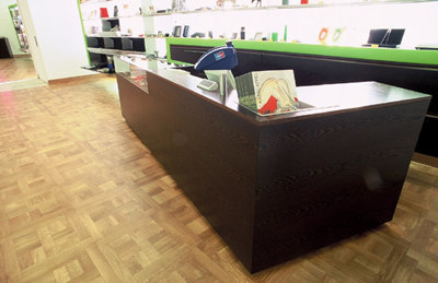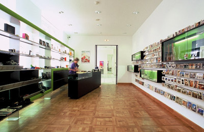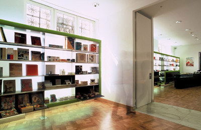 Langgezogene Screens verleihen dem vielgestaltigen Warenangebot eine übersichtliche Fassung, der signalhafte Grünton des Kunstlederrahmens sorgt für eine klare Trennung zwischen Raum und Verkaufsobjekten. Postkarten, Kunstnippes, kleine Kostbarkeiten werden von der linearen Grossform aufgefangen, mittels variabel setzbarer Tabletts lassen sich spezielle Produktgruppen hervorheben. Die Präsentationselemente scheinen vor den weißen Wandflächen zu schweben: Mit jeweils nur drei 6 mm starken Stahlblechen stehen sie am Boden und können (man weiß ja nie) je 1.000 kg Last abtragen.