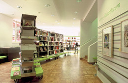 Ein 7,5 Meter langes, fahrbares Möbel mit hohem Bücher-Fassungsvermögen steht frei, von allen Seiten zugänglich, mit einem leichten Knick in der Mitte des Verkaufsraums und lässt sich bei Bedarf an den Rand rollen, um bei Veranstaltungen beispielsweise als Projektionsfläche zu dienen. Kassenmöbel und Warenvorratsbox treten als geschlossene Körper aus dunklem Wenige-Holz als eigenständige Elemente räumlich in den Hintergrund. (Text: Gabriele Kaiser, 03.10.2002)