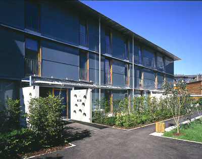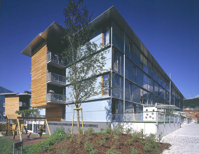 Alle Wohnungen öffnen sich mit großformatigen Fensterflächen zu geräumigen Süd-Balkonen und Terrassen und bilden somit einen natürlichen Sonnenschutz für die steil stehende Sommersonne, während die wärmende Wintersonne tief in die Wohnungen vordringen kann. Die einzelnen Haustypen sind als Zwei-, Drei- und Vierspänner über helle Stiegenhäuser erschlossen, deren zusätzliche Lichthöfe die innenliegenden Küchen und Bäder mit Tageslicht versorgen. Die Wohnanlage erreicht Energiekennwerte (25 kWh/m2 per anno), die einem Niedrigenergiehaus entsprechen, und etwa 55 Prozent des jährlichen Warmwasserbedarfes wird durch eine Solaranlage gedeckt. (Gabriele Kaiser nach einem Text des Architekten, 06.03.2003)