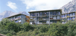 Die 3 drei- bzw. viergeschossigen Baukörper (Stahlbetonskelett, hinterlüftete Glasfassade, Holzfertigteilelemente als Aussenwand) sind in zwei Zeilen in Ost-Westrichtung situiert, wobei die hangseitige Staffelung dafür sorgt, dass für alle 60 Miet- bzw- Miet/Kauf-Wohnungen Aussicht und Besonnung gleichermaßen stimmen. Die topografisch an den bestehenden Felshügel angepasste Lage der Gebäude lässt ruhige Wohnhöfe mit privaten Gärten in differenzierten Ebenen entstehen, denen ein Kinderspielplatz sowie gemeinsam nutzbare Grünflächen zugeordnet sind. Diese Maßnahme soll die Bildung kleiner nachbarschaftlicher Soziotope ermöglichen.