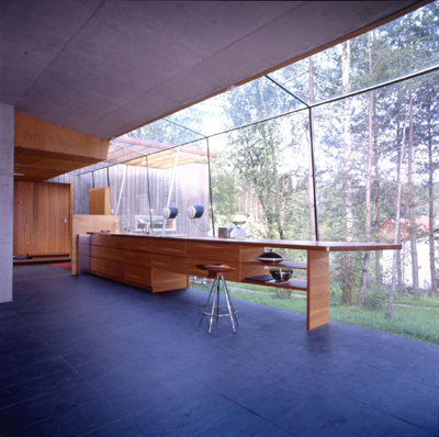 Die Sorgfalt, mit der die Vorzüge des Grundstücks ausgelotet und mit den Wünschen der Bauherrn verschränkt wurden, zeigt sich bis ins Detail. Entstanden ist ein ins Grün fließendes harmonisches Gefüge aus teils luziden, teils kompakten Körpern mit vielfältigen Freiräumen, die das hautnahe Erleben der Natur und der Jahreszeiten möglich macht. Feyferlik und Fritzer konzipieren ihre Häuser mit leichter Geste und setzen sie exakt wie eine japanische Pinselzeichnung. Dieses Haus erreicht ohne großen Aufwand Niedrigenergie-Standard. Mit und in ihm lässt sich sowohl Energie sparen wie Energie tanken.