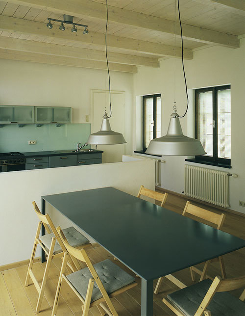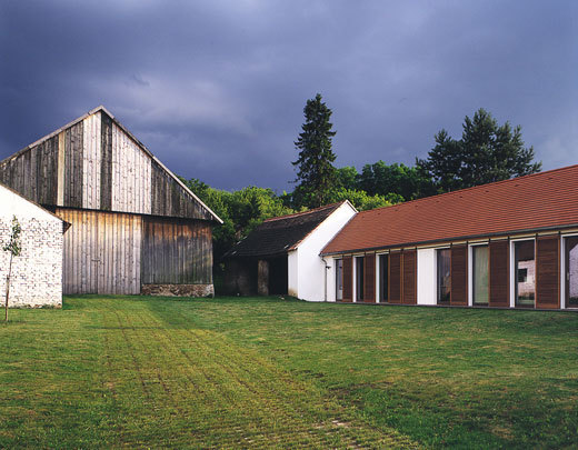 Aufbauend auf eine Bestandsaufnahme wurde der Neubau mit den städtebaulichen und proportionalen Qualitäten des Altbaues geplant, um die Atmosphäre und räumliche Qualität des Hofes, der Einfahrt und die Bezüge zum dörflichen Gefüge und dem Grundstück zu erhalten. Die Scheune und eine Wagenremise im Übergang zum Obstgarten konnten in den Neubau integriert werden. Die Einheit aus Wohnen und Arbeiten, die prägend für diese Hausform war, wird durch das Atelier der Bewohnerin, die Malerin ist, angesprochen. Wesentlich war es, mit dem Neubau eine ökonomische Lösung umzusetzen, die Qualitäten des Bestands mit dem Komfort individueller Nutzung zu verbinden vermag. (Text: Architekten)