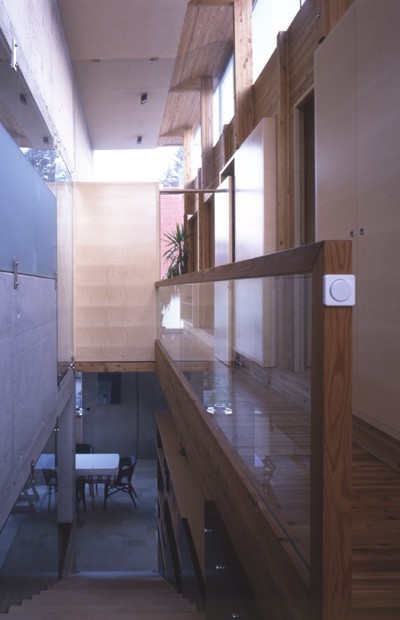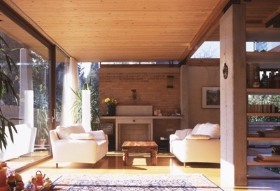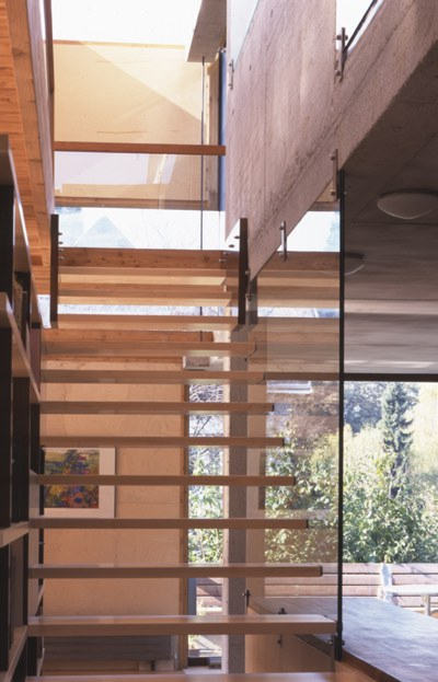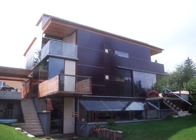Von außen wirkt das Gebäude äusserst kompakt. Es präsentiert sich nach Süden sehr offen mit einem zur Freifläche erweiterten Wohnraum. Nach Norden, zum Garten hin, zeigt es sich eher geschlossen, obwohl die Öffnungen für ausreichende Durchlichtung der Räume sorgen. (13.08.2001)