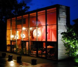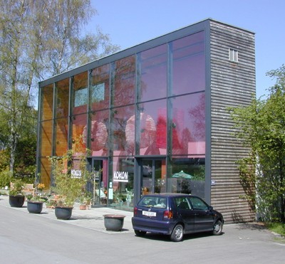 Zusätzlich hat die Vitrine aus Holz die Funktion für die Wärmegewinnung des gesamten Gebäudes zu sorgen. Vergleichbar mit einem Glashaus wird darin Wärme produziert, mit der in der Übergangszeit der Innenraum der Halle beheizt wird. (16.07.2001)