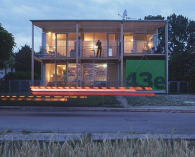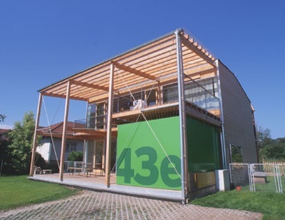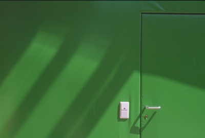 Am Eingang tritt eine grüne Box markant in Erscheinung, dahinter verbirgt sich der Keller-Ersatzraum, der zusätzlich als überdimensionales Hausnummernschild verwendet wird. (13.08.2001)