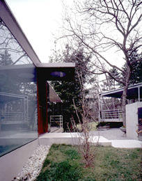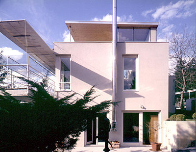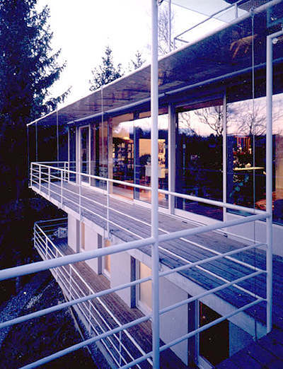 Auf der unteren Ebene liegen in serieller Folge die Schlaf- und Nebenräume, erweitert durch ein Balkonband, das sich ebenfalls westseitig über die gesamte front erstreckt. (Text: Architekt, 10.04.2003)