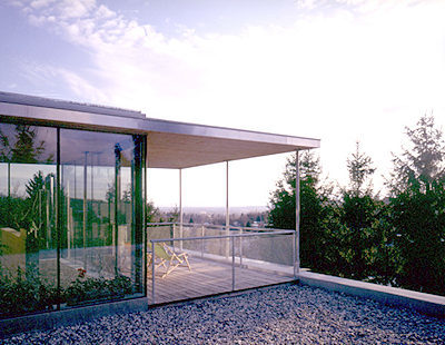 Die verglaste „Laterne“ darüber bringt Tageslicht von oben ins Wohngeschoss und erschließt die Dachterasse, die ihrerseits durch ein weit auskragendes Dach Sonnen- und Witterungsschutz bietet.