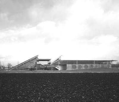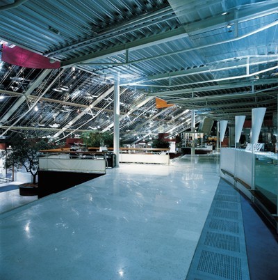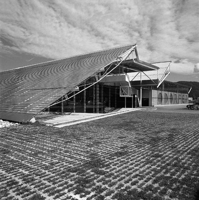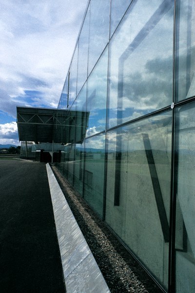 Das weit vorgezogene Glasdach mit dem anschließenden Wasserbecken vermittelt durch ein gekonntes Detail den Eindruck dass die Glasfassade scheinbar im Wasser versinkt. Das Glasschild ist 30 Grad geneigt und hat die Ausmasse von 75 Meter Länge und über 20 Meter Breite. Es kann in zwei Sektionen über seine ganze Länge geöffnet werden und bildet Fassade und Dach zugleich. Die gebäudehohe Glaswand vor dem Warenlager ist die Wärmedämmung der tragenden Betonscheiben dahinter. Die Warenanlieferung an der Südseite des Gebäudes wird durch das auskragende Dach geschützt. Eine einfache wie auch kühne, 8 Meter aus der Fassade auskragende Konstruktion. (23.07.2001)