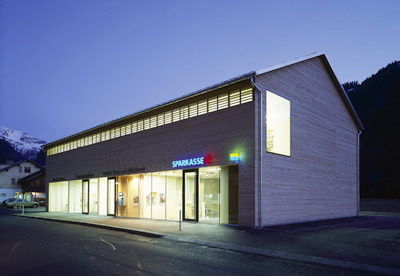Die Durchlässigkeit des Kultur- und Geschäftshauses wird in der Erdgeschosszone an den Längsfronten durch raumhohe Verglasungen und einen geschliffenen, scheinbar durch das Gebäude durchlaufenden Asphaltboden verstärkt. Die Sicht auf den dahinter liegenden Platz (und später auf die Fassade des Feuerwehrhauses) bleibt unverbaut. Die unterschiedlichen Funktionen von Bankfiliale, Tourismusbüro und Friseur sind schichtartig nebeneinander gesetzt, die Erschließung für das in seiner Nutzung „konzentriertere“ Obergeschoss durchläuft exakt die Mitte. Die von der Strasse abgewandten Räume für die Dorfmusik und die Bücherei orientieren sich in Richtung der grossen Grünflächen im Süden. Die hinterleuchtete Informationswand des Franz Michael Felder Museums (der Schriftsteller, Volksbilder und Sozialreformer -- 1839 in Schoppernau geboren – hat u.a. ein Dialektwörterbuch, das „Bregenzer Idiotikon“ verfasst) erstreckt sich über die ganze Länge des Baukörpers und steht durch zwei raumhohe Fenster in den Giebelwänden visuell mit den realen Bildern des Dorfes in Beziehung.