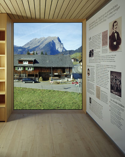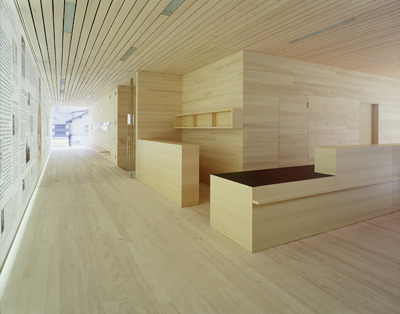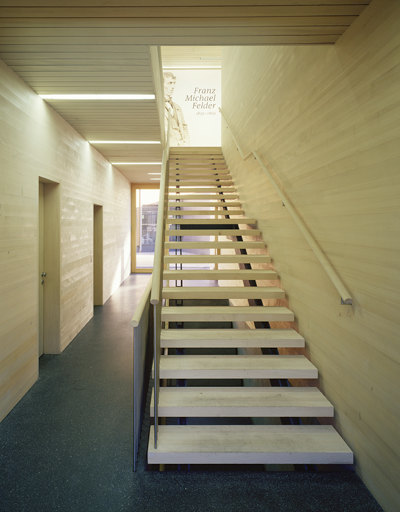 Sowohl in der Aussenverkleidung (horiziontal verlaufendende Rhombusschalung) als auch im Innenausbau haben die Architekten mit unbehandelter, sorgfältig verarbeiteter heimischer Weißtanne gearbeitet, ein sägerauer Dielenboden verleiht den Kulturräumen des Obergeschosses einen Charakter fühlbarer Intimität. (Text: Gabriele Kaiser)