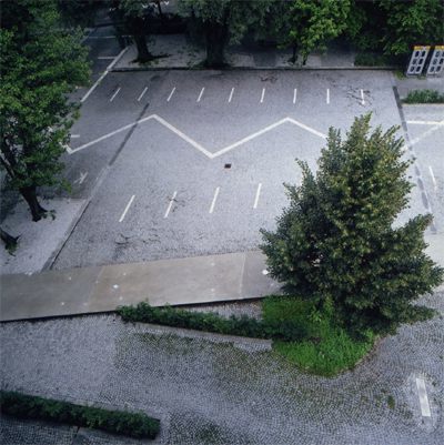 Mit den verwendeten Elementen - industrielle Fertigteile und Heckenbepflanzungen - Fläche wird sie in Bezug gesetzt zur Platte, horizontal sowie vertikal, indifferente Wege werden überlagert vom definierten Wegesystem, die organische „Unordnung“ der bestehenden Bäume wird in Bezug gesetzt zur strikten Ordnung der neugepflanzten Hecken, diese ist ca. 1 Meter hoch und wird kontinuierlich geschnitten.