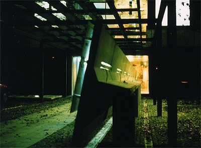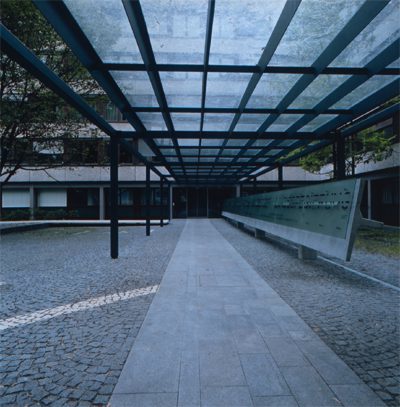 Von der Michael-Pacherstrasse zieht die horizontale Platte schräg in Richtung des Hauses und des Haupteinganges, ungefähr 15 cm über dem Pflaster, der Platz geht darunter hindurch. Diese Platte beschränkt den Fahrverkehr und ist gleichzeitig Weg und Leitobjekt vom öffentlichen Gehsteig zum Haupteingang in den Platz. Dort wird, durch die vertikale Platte, die Gehrichtung umgelenkt. Das vorgehängte Ornamentglas, indirekt beleuchtet, wird zum Schriftträger und Wegweiser. Die Überdachung ist Teil des Gebäudes, die tragende Formrohrkonstruktion ist im Stützenraster des Bestandes angeordnet, sie trägt das Glasdach aus gehärtetem Ornamentglas für den Eingangsbereich und den Fahrradabstellplatz. (26.03.2001)