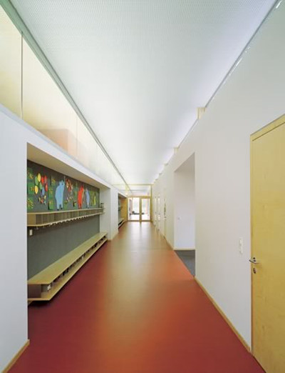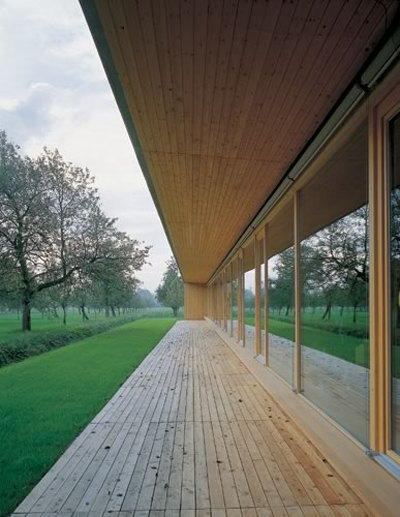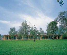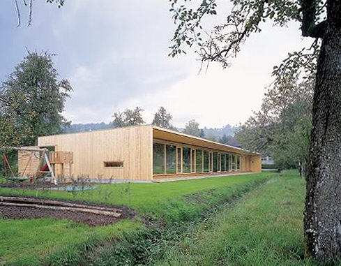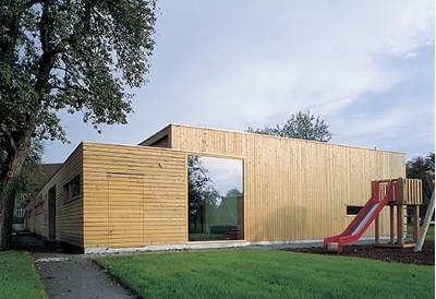 Eine Spielbox von eindeutiger räumlicher Gestalt: Der eingeschossige Kindergarten schiebt sich als langer, mit Tannenbrettern verschalter und zur südseitigen Wiese geöffneter Riegel zwischen die schönen Obstbaumbestände des Gartens. Die einfache strukturelle Gliederung des Raumprogramms mit nördlicher Erschließung, Nebenraumzeile, Erschließungszeile und Gruppenräumen, die sich mit ihren grossen Schaufenstern ins Grüne öffnen, kommt im Erscheinungsbild des Baukörpers zum Beispiel in der Änderung der Laufrichtung der Schalungsbretter (die Nebenraumzeile wurde horizontal, der Hauptbaukörper vertikal verschalt) auf einfachste Weise zum Ausdruck.Die Höhenabstufung von Haupt- und Nebenraumzone ermöglicht die Versorgung des Erschließungsganges mit Oberlichtern, zusätzlich ist die Stirn des Ganges grossflächig verglast, so dass der Weg optisch in die Wiese ausläuft. Bügelartig gefaltete Elemente mit weitem Dachvorstand fassen die drei Gruppenräume in einer schwellenlosen Reihe zusammen, deren langes Glasband Kinder und Garten einander auf selbstverständlichste Weise näherbringt. (Text: Gabriele Kaiser)