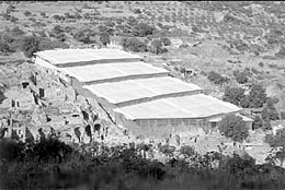 Man sieht es schon von weitem, das textile Dach über dem Hang mit der wertvollen Hanghausruine. Es fällt dabei nicht aus dem Rahmen der von weitem zunächst landschaftlichen Umgebung, es ist eher ein im Sonnenlicht schimmerndes architektonisches Fragezeichen, besser: ein Versprechen, das man unweigerlich aus der Nähe in Augenschein nehmen möchte, eine Art visueller Magnet.