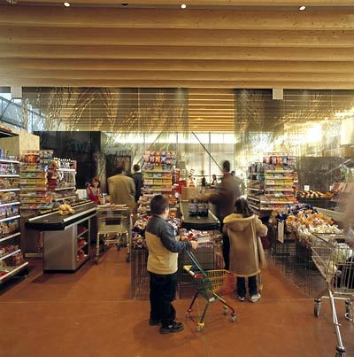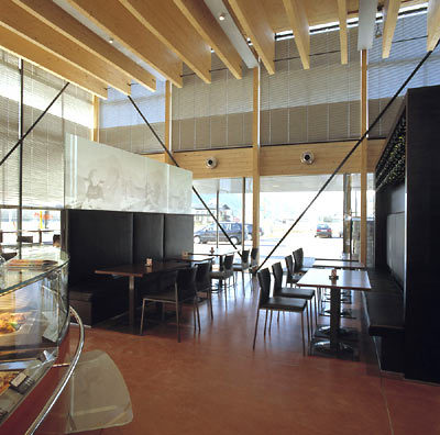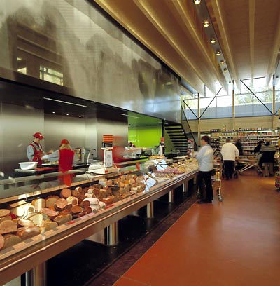 Obwohl die konstruktive Struktur in allen pragmatischen Details sichtblar bleibt, bietet der klar strukturierte Längsraum ein Szenario ruhiger Alltags-Noblesse. Im Baguette- bzw. Cafébereich findet der Baukörper an den Stirnseiten in einer verfeinerten Materialwahl und Lichtführung einen überzeugenden räumlichen Abschluss. (Text: Gabriele Kaiser)