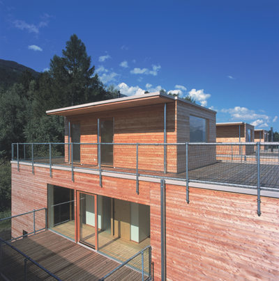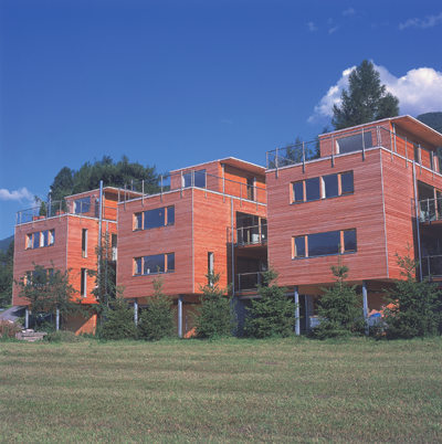 Das Modul misst im Grundriss 1,15 x 5,75 m, achtmal addiert ergibt es eine Standardlösung von 50 m² mit einem zentralen Stiegen- und Sanitär- bzw. Energiekern. Dieses Set kann zwei- bis dreimal übereinandergestapelt werden. Die im Rundlauf organisierten Räume sind nutzungsneutral, die Fassaden frei gestaltbar, Additionen in Längs- oder Querrichtung sind mit zwischengeschalteten Terrassen durchführbar. Die Konstruktion besteht aus einem innenliegenden Tragsystem mit Metallstützen und Brettschichtträgern, die in kürzester Zeit montiert werden. In diese Struktur werden die vorgefertigten Decken samt Böden, die Holzpaneele der Aussenwände und das Dach eingepasst und verschraubt. In den steck- und stapelbaren Kernen sind die kompletten Badezimmer, Küchen und Energiestränge integriert. Die Aussenwände sind frei von Leitungen, hochgedämmt, können mit variablen Deckschichten oder Solarpaneelen ausgestattet und bei Bedarf abgeschraubt, ersetzt oder im System erweitert werden. Ein Set mit 100 m² wird in drei Wochen gefertigt, in einem Tag auf dem Fundament montiert, ist billiger und flexibler als konventionelle Bauten. (Text: Otto Kapfinger, 12.03.2003)