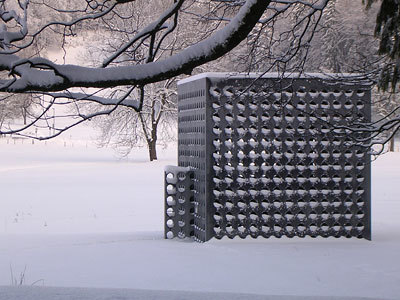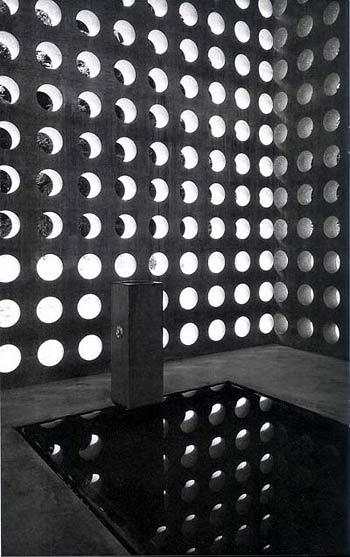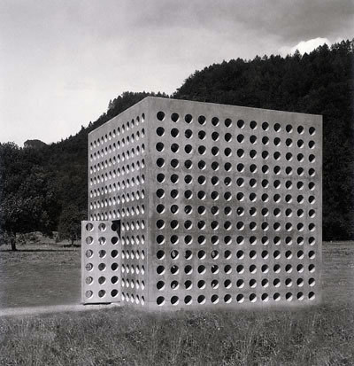 Der 5 x 5 Meter große Betonkubus mit seinen 820 präzise gebohrten Öffnungen (Lochdurchmesser 25 cm) steht als perforierter Monolith in der Wiese und umschließt ein rechteckiges Wasserbecken und eine Trinkstele (die in baugleicher Art auch im Hof des Bildungshauses errichtet wurde). Mit seinem ebenfalls durchlöcherten Dach in Form einer nach innen gekippten Pyramide bleibt der „Schwellenzustand“ des Pavillons zwischen Schutzfunktion und Ausgesetztheit, zwischen Offen- und Geschlossenheit auf spannungsvolle Weise unentschieden. Im Unterschied etwa zur verglasten Perforation in den Wänden der Donau-City-Kirche von Heinz Tesar bahnt sich durch die Löcher des Wasserhauses St. Arbogast nicht nur das Licht den Weg, sondern auch Regen, Wärme/Kälte und Wind. Aber trotz dieser membranhaften Durchlässigkeit bleibt der Betonkubus ein deutlicher Filter zwischen Innen und Außen. Bei einem Beton-Luft-Mischungsverhältnis von ca. 2:1 zugunsten des Betons bleibt eine Wand immer noch eine Wand. Das Projekt bot zudem den willkommenen Anlass, den zuvor in eine Betonwanne gezwängten Kalkofenbach zu renaturieren. (Text: Gabriele Kaiser, 6.04.2004)