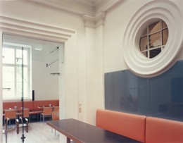 Mit geringsten Mitteln sollte ein grösstmöglicher Gewinn an neuer Identität für das Haus geschaffen werden. Nach dem Wechsel das Cafe-Pächters im Jahre 1999 wurde das Cafe im Künstlerhaus umgebaut. In weiterer Folge wird die Eingangssituation geändert und eine vorgelagerte, gedeckte Terrasse direkt an der Salzach entstehen. (16.07.2001)