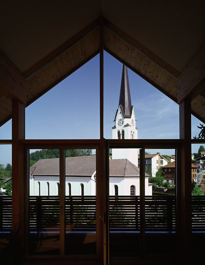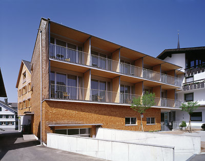 Zusätzlich wurde auf dem ehemaligen Areal des Gasthofes Kreuz im Westen ein zweiter viergeschossiger (E+2+D) Neubau errichtet. Dieser beherbergt im Erdgeschoss den Nahversorger ADEG, im ersten Obergeschoss zwei Arzt-Praxen sowie ein Planungsbüro und – im 2. Ober- und Dachgeschoss – weitere Gästezimmer für den Gasthof Löwen. Beide Neubauten sind in kombinierter Massiv- und Holzbauweise ausgeführt. (Text: Architekt)