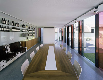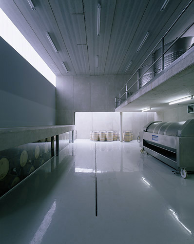Die Konstruktion des Kellers selbst besteht aus einer Sichtbetonschale, die den Keller temperiert. Der zweischalige Aufbau der Wandkonstruktion als Grundlage eines optimalen Klimas mit der natürlichen Abkühlung durch das Grundwasser unterstreichen den wesentlichen Ansatz für die Lagerung des Weines. In der untersten Etage reihen sich die Barriquefässer auf einem neuartigen Regalsystem, das eine einfache und flexible Handhabung der einzelnen Fässer ermöglicht. Durch einen transparenten Keil, konsequent und schlüssig aus dem unregelmäßigen Grundriss des Hofes abgeleitet, wird das Licht direkt in das Presshaus geleitet, das dadurch hell und klar wirkt. Vollkommen transparent bietet sich auf oberster Ebene der Degustationsraum dar, der gleichsam zu einem erweiterten Raum des Hofes, einer Art Loggia, wird. Dieser Eindruck wird durch die spezielle Verglasung verstärkt, welche durch vertikale, weinrote Bänder, ebenfalls aus Glas, rhythmisiert wird. Witterungsschutz und Wärmedämmung sind durch Profilbauglas gewährleistet, das durch die Verwendung einer weißen Folie die zweischalige Fassade betont.