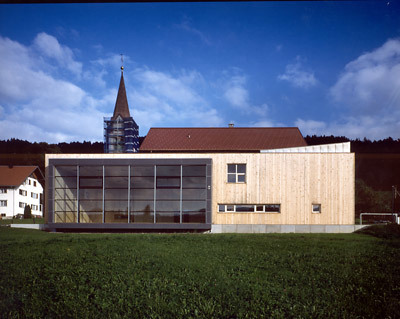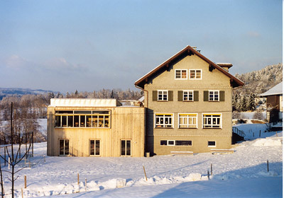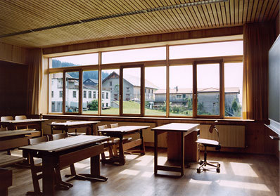 Die beiden Zubauphasen werden zu einem Ganzen verschmolzen und in strenger Form neben das alte Schulhaus gestellt. Ein Grundgedanke der räumlichen Konzeption bestand darin, die kleinen Zusammenhänge einer zweiklassigen Dorfschule erlebbar zu machen. Es gibt keine hermetischen Räume, die ganze Schule wird als Klassenzimmer erfahrbar und in vielfältiger Weise benutzbar. Wie im alten Schulhaus (aber auch im nahen Dorfgasthof) nur einfache, natürliche Materialien eingesetzt worden waren, so sollte es auch in neuen Bauteil zu keiner Materialentrfremdung kommen. Rohstoff war zur Hauptsache das in naher Umgebung gewachsene Holz der Weißtanne.