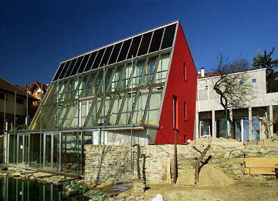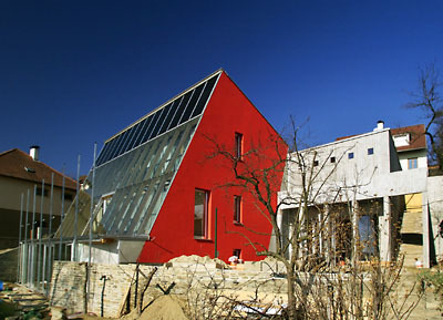 Baumeister Ing. Ernst M. Jordan MAS, Lehrbeauftragter für Solararchitektur an der Donau-Universität Krems, hat auf der exponierten Hanglage ein Niedrigenergie-Gebäude entwickelt. Für die Solararchitekten ist das Haus der Zukunft ein Selbstversorger: es holt sich die Heizenergie über große Südverglasungen von der Sonne, speichert sie in inneren Steinmassen, verteilt sie mit Hypokaustensystemen dosiert auf alle Räume, holt sich komplementär dazu kühlende Luft aus dem Erdreich unter dem Keller und nützt auch das Regen- und Brauchwasser in ökologischen Kreisläufen. So mutiert das Einfamilienhaus - bisher die teuerste, aufwendigste Bauform – vom Energiefresser zum autarken, ressourcenschonenden Habitat.