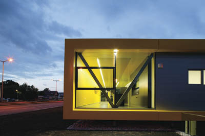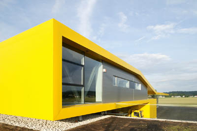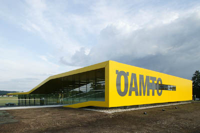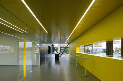 Eine fließende, den Geländesprung akzentuierende Raumfolge erstreckt sich mit vier unterschiedlich formulierten Schauseiten über das Grundstück. Handfeste Corporate Identity in Form von fassadenfüllenden Headlines gehören hier ebenso zum Programm wie die Omnipräsenz der Farbe Gelb. Durch Sorgfalt in der Detailbearbeitung (Raumgelenke, Materialübergänge, Lichteinfälle) unterscheidet sich dieses „Kompetenzzentrum“ wohltuend von der ausschießlichen Oberflächenverliebtheit vergleichbarer baulicher Zeitgenossen. (Text: Gabriele Kaiser)