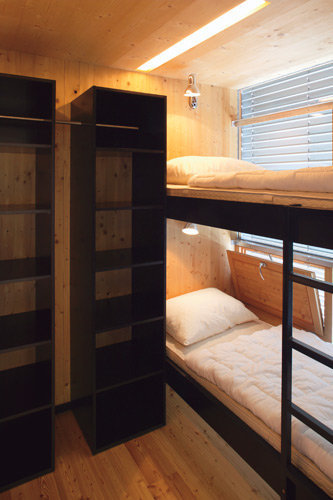 Modulares Bauen, Serienproduktion, Flexibilität, Ortsungebundenheit, all dies suggeriert der vor rund fünf Jahren formulierte Anspruch von HolzBox. Das Innsbrucker Architekturbüro konnte 2003 den Wettbewerb der steiermärkischen Landesregierung für ein multifunktionales Campmodul für Jugendliche und Familien für sich entscheiden. Das modulare Musterkonzept sollte die architektonische, infrastrukturelle und funktionale Qualität von Ferienherbergen verbessern. Gefordert waren ein Betreuermodul mit einem Bett, ein Jugendraummodul mit sechs und ein Familienmodul mit vier bis fünf Betten. Die Lösung von HolzBox war einfach: drei gleich lange, beliebig kombinierbare Containermodule aus Massivholzplatten. Denn obwohl ursprünglich eine Ausführung in Holzrahmenbauweise geplant war, entschieden sich die Architekten im Lauf des Umsetzungsprozesses für die Holzmassivbauweise mit Brettsperrholzplatten, da diese, so Ferdinand Reiter, der Architektur viel eher entsprach und nicht zuletzt aufgrund der geografischen Nähe zu den steirischen Produzenten auf der Hand lag.