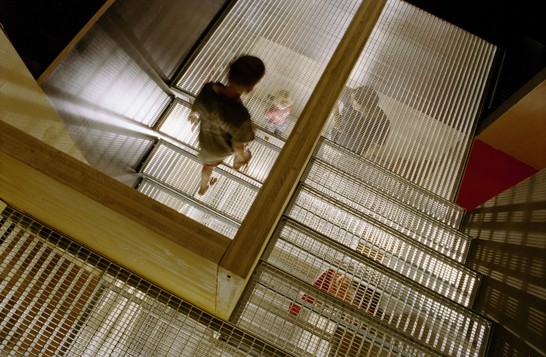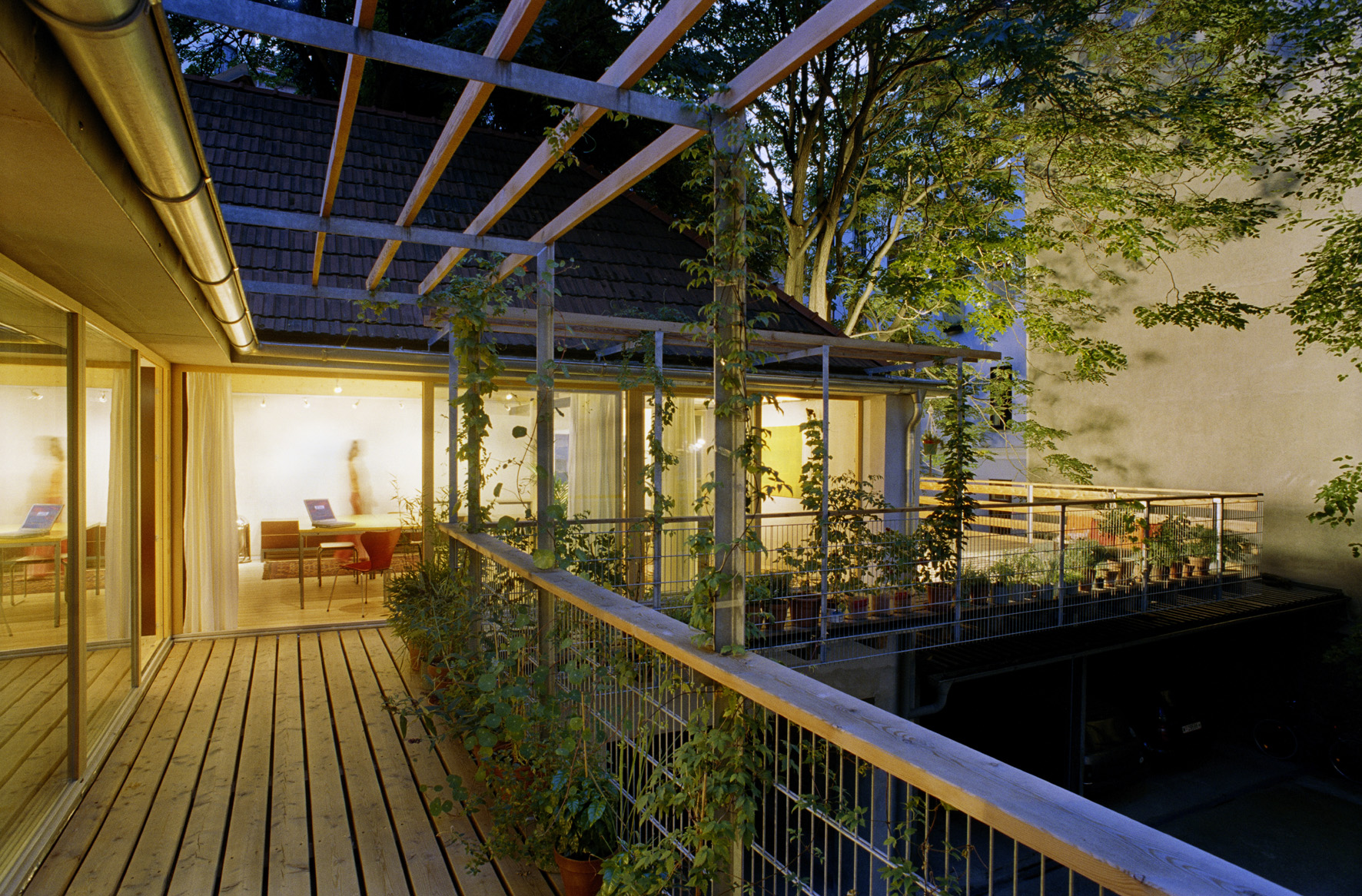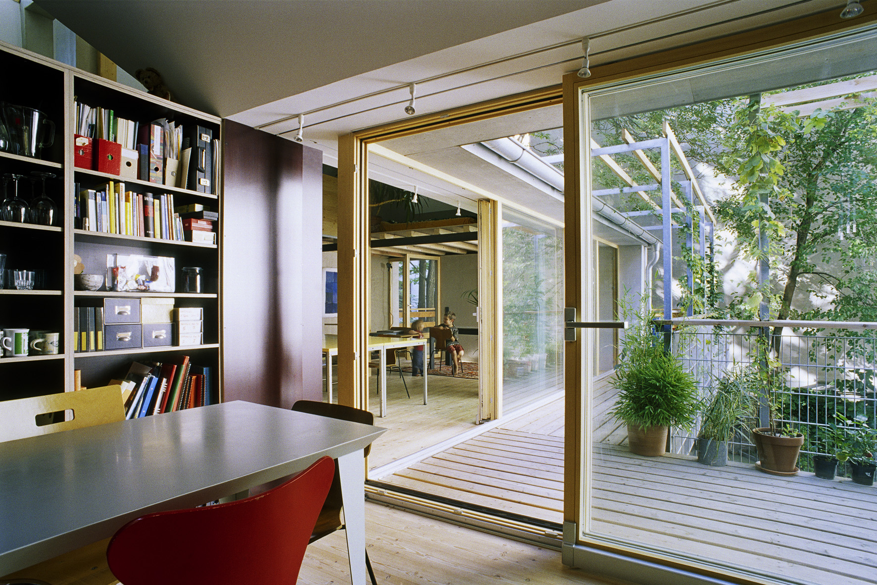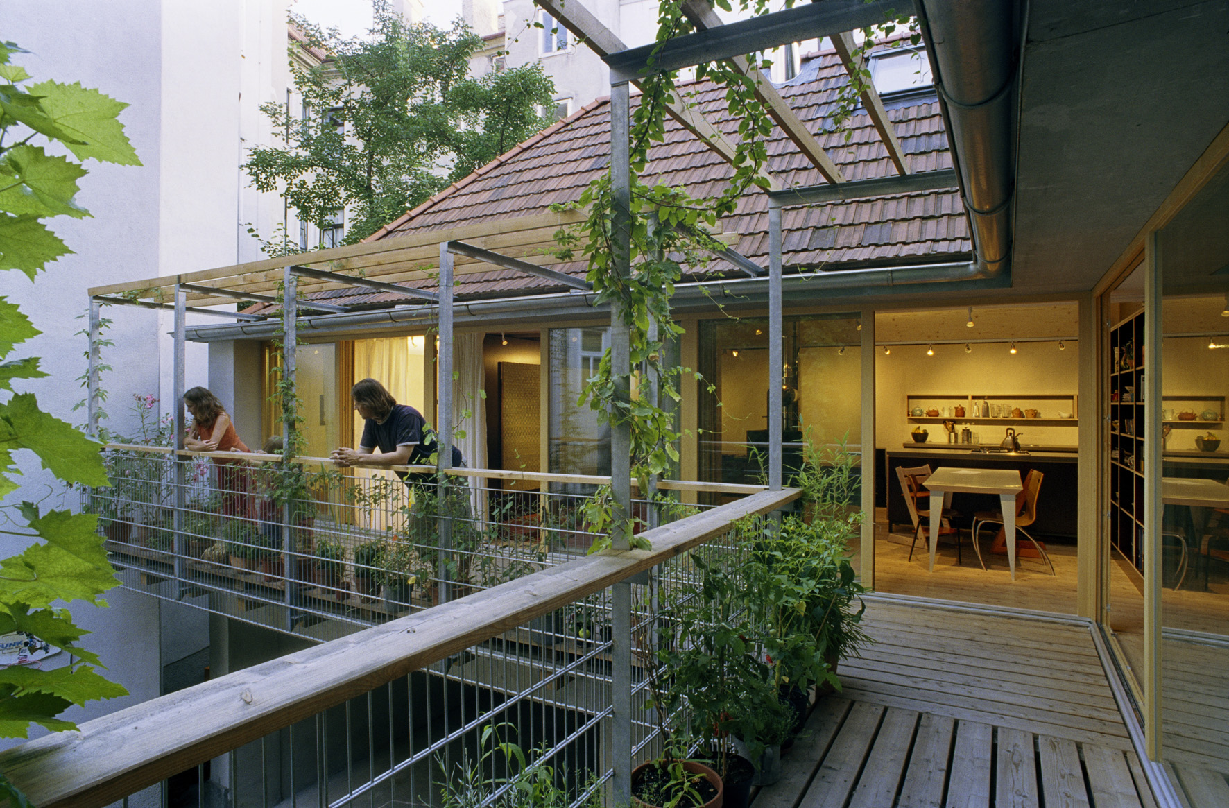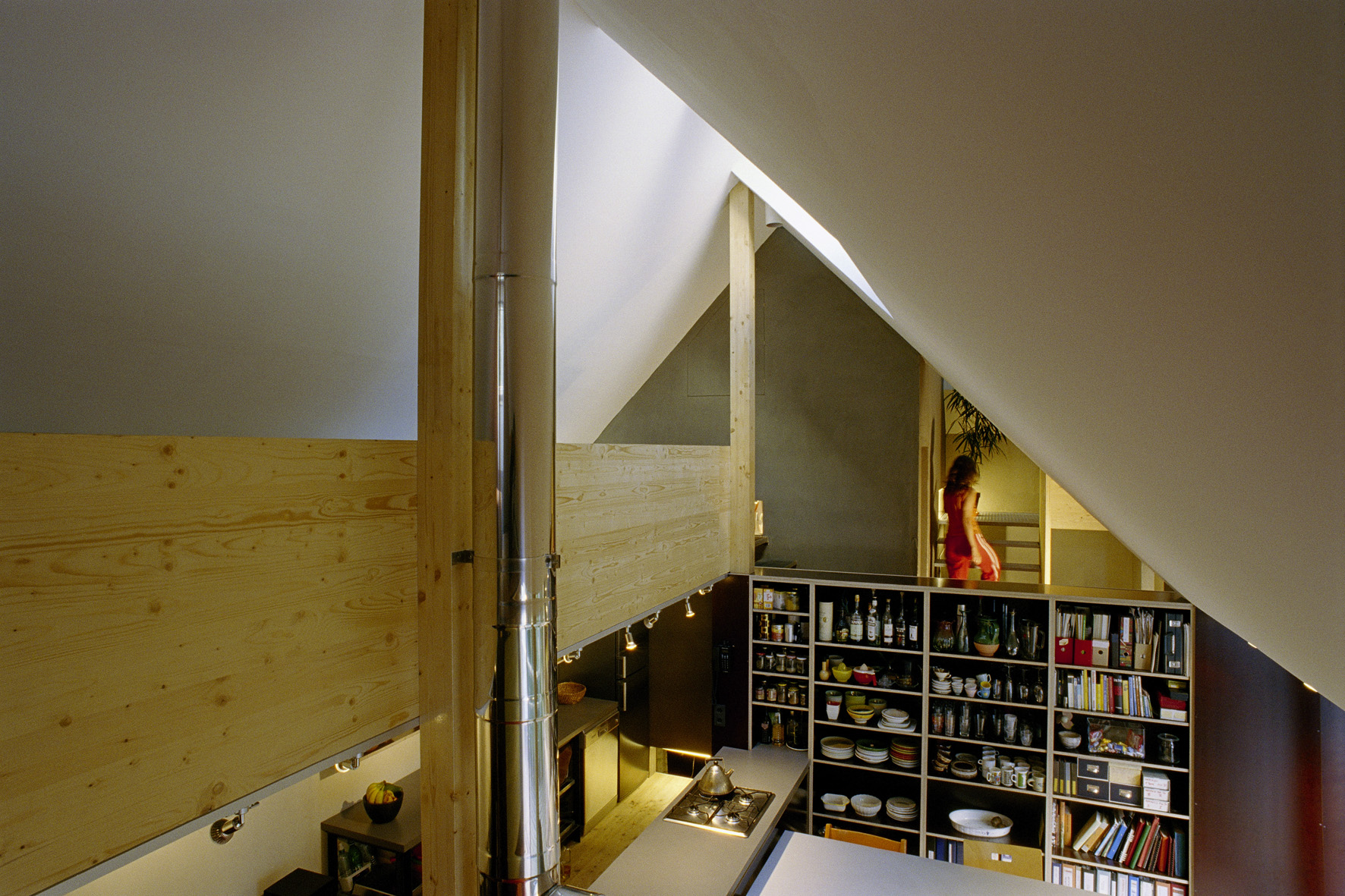 Der alte Dachstuhl wurde abgetragen, die Feuermauern abgesenkt, hofseitig die Traufe angehoben und zurückversetzt, ebenso der First. Auch eine bestehende Giebelwand wurde geöffnet, um das Raumvolumen nach außen zu öffnen und vielfältige Sichtbezüge zu ermöglichen. Um auch die Belichtung der benachbarten Innenhöfe nicht zu beeinträchtigen, wurde der Umriss des ehemaligen Pultdachs zugunsten eines Walmdachs verändert. Die Konstruktion in Leichtbauweise (Holzskelettbau) lagert auf dem bestehenden Gebäudesockel (der wie zuvor als Garage genutzt wird), die Aussteifung erfolgt über schubsteife Wand- und Dachflächen. Ein wesentlicher Aspekt der Ressourcenschonung war auch der bewusste Umgang mit „anfallendem“ Material: Teile des alten Dachstuhls konnten wiederverwendet werden, auch die alten Dachziegel bzw. Dachbodenziegel kamen im neuen Kontext wieder zum Einsatz. Das ist nicht nur ökologisch sinnvoll, sondern verleiht dem „Ausbau“ inmitten eingewachsener Substanz ein hohes Maß an Selbstverständlichkeit. Räumlich hat die Wohnung mit Atelier (Nutzfläche 180 m²) sowohl aussichtsreiche als auch einblickgeschützte Zonen zu bieten. Das Stiegenhaus erschließt zwei Zwischengeschosse mit Bädern und Nebenräumen sowie die beiden Dachflügel. Die dem Hof zugewandte Schiebetürverglasung (plus vorgesetzter Balkonzone) sorgt für Helligkeit und entspricht dem Passivhaus- bzw. Niedrigenergiehaus-Standard.