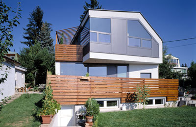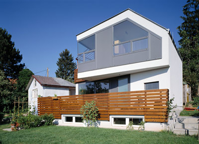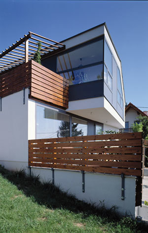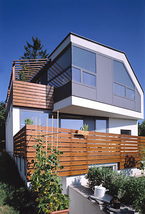 Das Obergeschoss dagegen gerät zu einem fulminanten räumlichen Feuerwerk: Aus einer konstruktiven Einheit von nur zwei massiven Außenwänden und enorm weit auskragenden Dachflächen – die Grenzen zwischen Wänden und Dachflächen aus Beton sind fließend – entsteht mit dem Obergeschoss eine Figur, die an eine leicht geöffnete Muschel erinnert. Aus diesem extrovertierten Innenraum, der durch die deckelnde Dachfläche gleichzeitig eine höhlenhafte Geborgenheit entstehen lässt, bietet sich den Bewohnern ein großartiges Panorama über Wien.