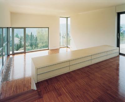 Die Erschließung durch das Haus beginnt bei der Eingangstreppe aus Stahlbeton, setzt sich durch das Haus bis in den Garten fort. Durch die so angelegte Wegführung bleibt der Hang auch im Inneren des Hauses erlebbar. Durch die Hanglage entwickelt sich der Baukörper auf Gartenseite bis zu einer Höhe von etwa 8 Metern und öffnet sich durch grosse Verglasungen, Schiebetüren und Treppenführung in den Garten. Ein an der Dachkonstruktion abgehängter Balkon im Obergeschoss, wirkt wie eine „Schublade“, die aus dem Gebäude herausgezogen wurde und betont so die Längsorientierung des Hauses.