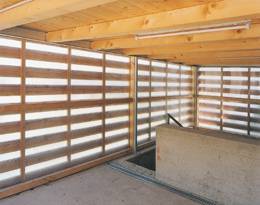 Die Zimmer sind jeweils als „Boxen“ unter ein grosses, gemeinsames Dach gestellt. Jedes Zimmer entwickelt sich unterschiedlich nach den jeweiligen Anforderungen der Nutzer - innerhalb des gleichen Querschnitts. Das Dach - ein flachgeneigtes Sprrendach - bleibt als Grossform erkennbar, zusätzlich betont durch verglaste Anschlüsse der Raumschachteln an die Dachuntersicht.