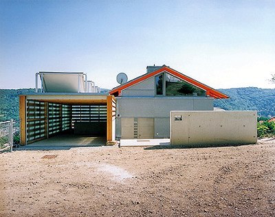 Die Lichtführung und Raumentwicklung im gesamten Haus wurde vorrangig behandelt. So wurden nur Materialien gewählt, die eine warme, helle und ruhige Atmophäre ausstrahlen. An der Strassenseite liegt der Eingangsbereich mit Garage, auf der Sonnenkollektoren und eine Satellitenantenne angebracht sind. Sie sind als Teile der Gestaltung mit in das Konzept des straßenseitigen Erscheinungsbildes einbezogen worden.