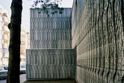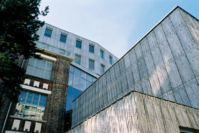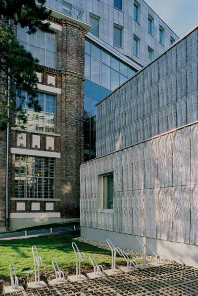 Am stärksten jedoch entfacht der Dialog zwischen Alt und Neu in der Frage der Bekleidung: Gewissermaßen als Replik auf die Struktur der Sichtziegelfassade (vor der Stahlbetonskelettkonstruktion) des Sobotka-Bestands wurde den Neubauten (Stahlkonstruktion und Betonfertigteilwände) ein Mantel aus Aluminiumgusstafeln vorgehängt, die mit Pflanzenmotiven reliefartig strukturiert sind. In der Serialität ihrer „Fügung“ offenbart sich Ungleichartiges in erstaunlicher Gleichwertigkeit. (Text: Gabriele Kaiser)