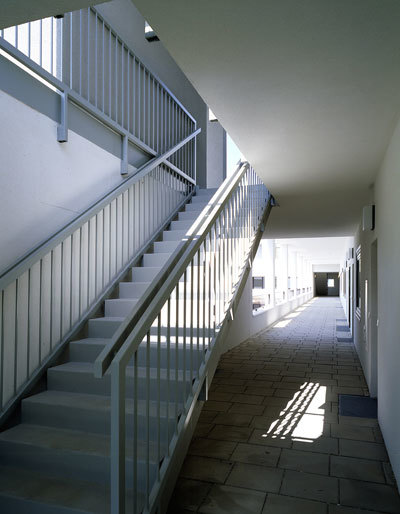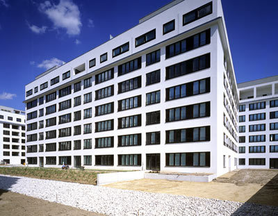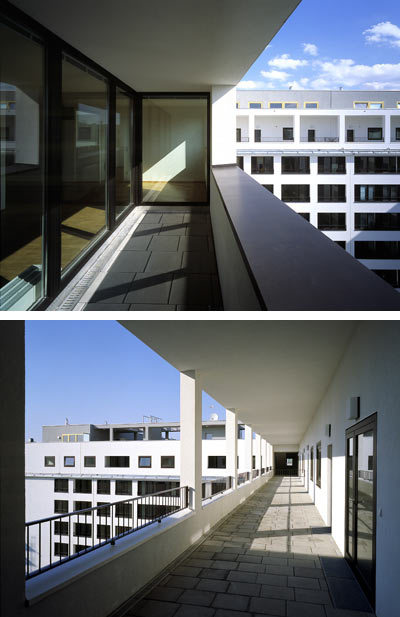 Nach außen wirkt der in Stahlbeton ausgeführte Baukörper in seiner seriellen Klarheit zurückhaltend und distanziert – den inneren Variantenreichtum (40 verschiedene Grundrissvarianten für insgesamt 206 Wohnungen) bergend. In den beiden oberen Geschossen mit Laubengangerschließung stehen der häuslichen Allgemeinheit auf den drei Seitenflügeln Gemeinschaftsterrassen mit Sauna und Solarium zur Verfügung. Innerhalb der Wohnungen (Durchschnittsgöße 78 m²) sorgen verschiebliche Glastrennwände bzw. die transparente Innen-Loggien für räumliche Großzügigkeit. Auch das eigens entwickelte Holz-Alu-Fenstersystem stellt im Rahmen des geförderten Wohnungsbaus eine qualitätssteigernde Besonderheit dar. Die Sorgfalt endet nicht an der Haustür: Kleine von der Landschaftsplanerin Anna Detzlhofer entworfene Hügel und Wälle fassen die rationale Struktur der Bebauung, und die öffentlichen Flächen blieben – zum Wohle des Gesamtkonzepts – gänzlich unmöbliert. (Text: Gabriele Kaiser)