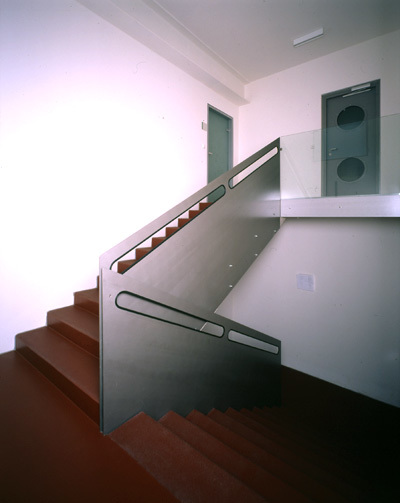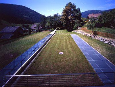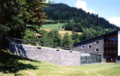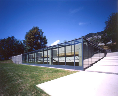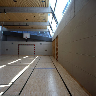 Zu den wesentlichen Prämissen des Entwurfs gehörte die Eignung der neuen Halle für außerschulische Zwecke, ohne den eigentlichen internen Betrieb zu gefährden. Die Kubatur mit den Innenmaßen von 10 x 20 Meter wurde zum Großteil in die Erde abgesenkt, der geringfügig „herausragende“ Teil ist verglast und scheint schwebend in die Landschaft gebettet. Die südseitige Glasfassade geht im Westen und in Anlehnung an den Bestandsbau in eine Granitsteinfront über, zwei unterschiedlich gestimmte Plätze werden als Pausenfreiraum gerne genutzt. Die innenräumliche, den vielfältigen Nutzungen angemessene Neutralität der Halle (Sichtbeton, kunstlederbespannte Wandpaneele) wird dadurch verfeinert, dass sämtliche Turngeräte bei Bedarf in Nischen verschwinden. (Text: Gabriele Kaiser)