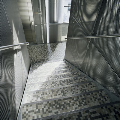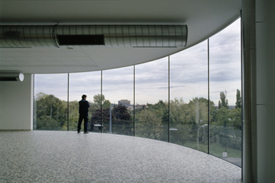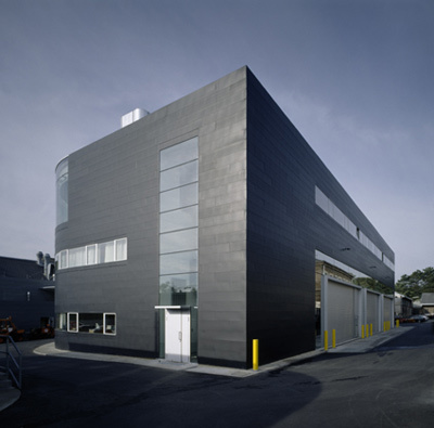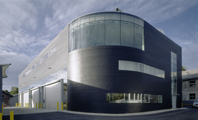 Die plastische Präsenz der beiden Baukörper (Stahlrahmenkonstruktion bzw. Stahlbetonbau mit hinterlüfteter Metallvorhangfassade) wird durch die flächbündigen Fensterbänder und die Bekleidung mit samtig grauen Kupfertitanzinkblechen verstärkt, und das geschwungene Panoramafenster im Obergeschoss der Hauptwerkstätte sorgt im Bereich des Speisesaals für ungeahnten Aussichtsreichtum. Das riesige Schaufenster ist bis zur Attikaoberkante hochgezogen – dies ist eine präzise gesetzte „große Geste“, die das Gebäude nicht nur nobilitiert, sondern auch atmosphärisch bereichert. Eingestellte Rolltorboxen durchbrechen die flächenbündige Homogenität der Werkstätte (Hallengrundmaß 50,7 x 20,7 Meter), in deren Erdgeschoss bis zu 18 MA 48-Fahrzüge zur Reparatur und Reingigung abgestellt werden können. Über einem für Bürozwecke genutzten Zwischengeschoss liegt der Sozialbereich für ca. 150 Bedienstete: mit Garderoben, Sanitäranlagen, Aufenthaltsraum, einem Bürotrakt und dem erwähnten Panorama-Speisesaal ist hier für das Befinden der Mitarbeiter wohl bestens gesorgt. Um den Freiraum zwischen Hauptwerkstätte und kleinerer Prüfhalle bzw. der Garageneinfahrt teilweise zu überdecken, haben die Architekten ein signifikant gefaltetes Membrandach entwickelt, das dem gesamten Ensemble eine zusätzliche Leichtigkeit gibt.
