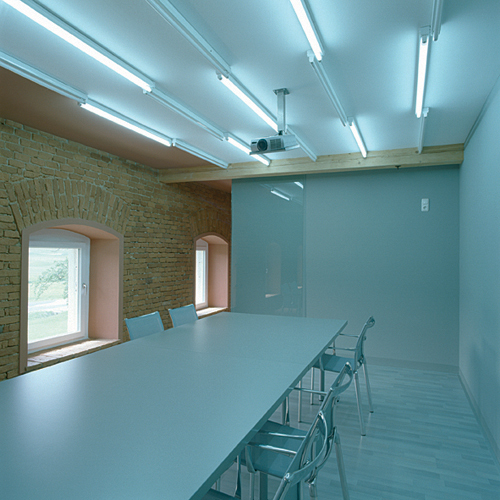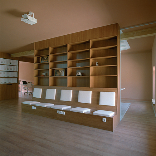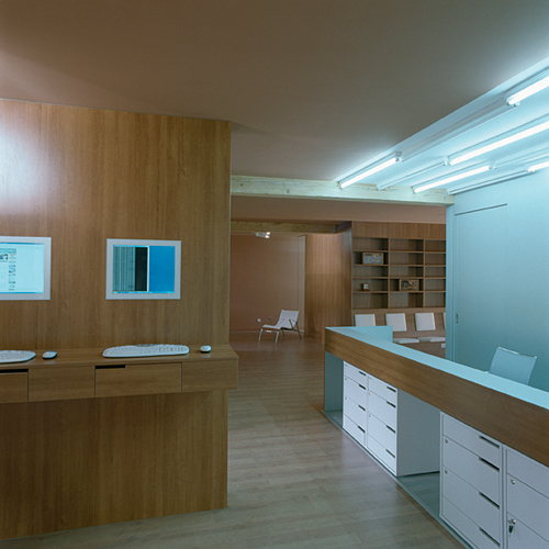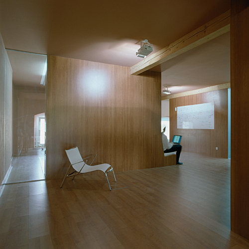 Um den vorhandenen Großraum die Großzügigkeit zu bewahren, bleibt er in seiner gesamten Dimension erlebbar. Er wird von drei eingestellten Boxen gegliedert und schafft somit Zonen unterschiedlicher Prägung und Lichtstimmung. Räume für unterschiedliche Tätigkeiten und Gedankenaustauschmöglichkeiten. Flexible Zeitorganisation erlaubt eine Mehrfachnutzung der vorhandenen Flächen. Besprechungen, Präsentationen und Konzentrationstätigkeiten finden im nüchtern hellgrau gestalteten Inneren der Boxen statt, dem jeweiligen Größenbedarf angepasst. Gemeinschaftsarbeiten, Pausen, Diskussionen an Flipcharts, Coffice-Aufenthalte und das Warten von Kunden findet in den in rotbraun gestimmten Außenzonen statt, deren Nischen Lounge-Flair vermitteln. Im Empfangsbereich etwa wird dem Kunden hier die Möglichkeit geboten, an den wandintegrierten Bildschirmen die letzten wichtigen Golftourniere anzusehen oder sich interaktiv über Themenbereiche im Internet zu informieren. Kirschholzfurnier und ziegelrot werden von den weißen Möbeln und Ordnern in den Regalen kontrastiert.