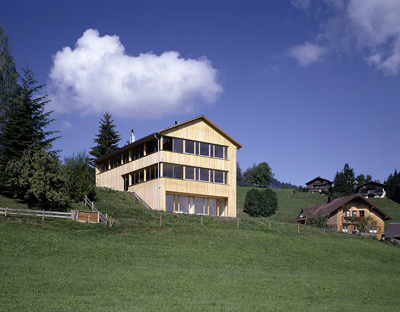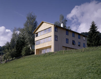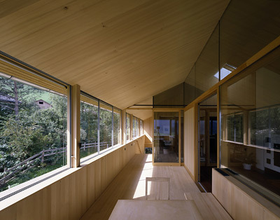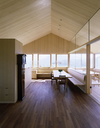 Die Grundrisse der beiden Apartments variieren insofern, als die obere Loggia zugunsten der Wohnfläche kleiner dimensioniert ist, jedoch bietet eine geräumige Sitzecke unten wie oben einen Platz an der Sonne. Der sorgfältige Innenausbau, eine homogene Innenhaut aus Holz und Glas, lässt auch die bis zum First hochgezogenen Dachschrägen im Obergeschoss als Annehmlichkeit empfinden, durch ein Oberlicht strömt zusätzliches Tageslicht herein. Trotz Anbindung an lokale Bautraditionen erweist sich das Haus in seiner räumlichen Organisation und klaren materiellen Umsetzung als ein der Gegenwart verpflichteter „Zeitgenosse“, der gewisse Qualitäten einer Typologie in neuer Interpretation wieder aufleben lässt. (Text: Gabriele Kaiser)