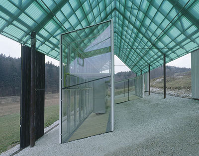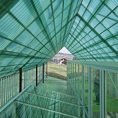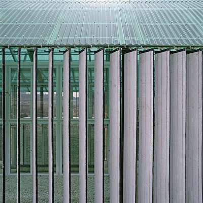 Ob sich die kokette Schieflage als „wohnlich“ erweist, kann von Mr. & Mrs. B. (den Bauherren) ausgiebig erprobt werden, der konzeptuelle Ansatz zieht derart lapidare Fragen ins Läppische, die Umwertung herkömmlicher Werte setzt hier besser an Wahrnehmungsmustern und nicht an konkreten Befindlichkeiten an. Da stehen auf einmal ganz andere Fragen im Raum wie z.B.: Wie verändert sich in einem archetypischen Glashaus mit Satteldach, bei durchlaufender Hangneigung und fremdem Materialkodex das Verhältnis von Innen- und Außenraum? Fügt sich ein transparenter Baukörper, der den Hang nicht ab- oder untergräbt, vielmehr diesen durch ihn hindurchziehen lässt, „besser“ in die Landschaft ein? Der Lamellenmantel an den Längsseiten ist drehbar und beweglich, lässt verschiedene Dichtegrade zu, schirmt ab oder reisst auf, lässt das Knochengerüst (12 querverspannte Rundstützen) hervortreten. Im gekiesten Geviert steht ein zweiter, teilweise zweigeschossiger Glaskörper mit drehbaren Flügeln und Holzboden, darin noch eine dritte Box, die Nasszelle – auf waagrechtem Grund. Mehrfach umhüllt dürfte sogar dieses Örtchen ein stilles sein. (Text: Gabriele Kaiser)